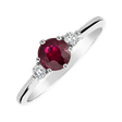 Luxusný prsteň s centrálnym rubínom je z každej strany doplnený čírym briliantom. Jemná obrúčka je vyrobená zo 14-karátového ružového zlata. Šperk je úžasný ako zásnubný prsteň alebo očarujúci darček.