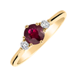 Luxusný prsteň s centrálnym rubínom je z každej strany doplnený čírym briliantom. Jemná obrúčka je vyrobená zo 14-karátového žltého zlata. Šperk je úžasný ako zásnubný prsteň alebo očarujúci darček.